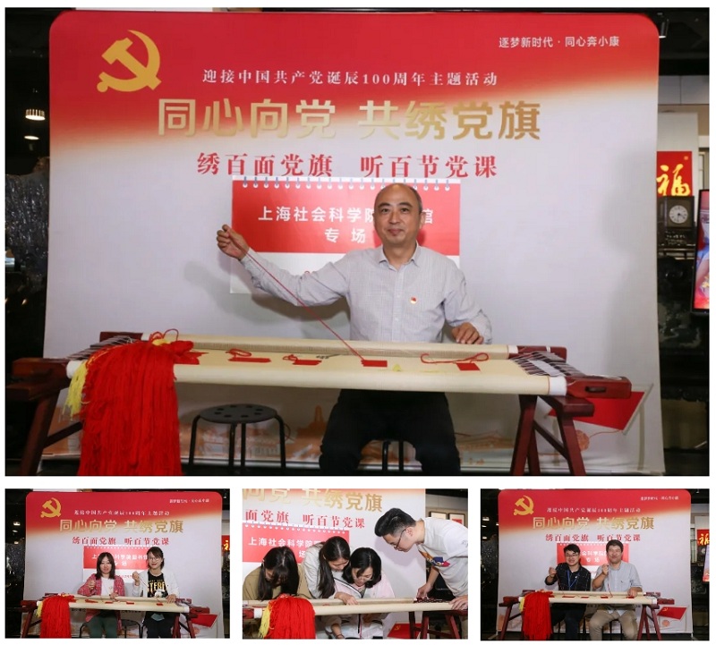 9月28日上午,上海社会科学院图书馆党支部书记、馆长钱运春率队赴恒源祥(集团)有限公司举行“共绣党旗”专场活动。恒源祥集团党委副书记顾红蕾,董事长、总经理办公室主任兼技术中心总监何爱芳热情接待了图书馆一行。在参观了恒源祥文化艺术展厅后,图书馆支部书记、馆长钱运春为“共绣党旗”专场活动绣了第一针,党员们也都参与了共绣党旗的活动。