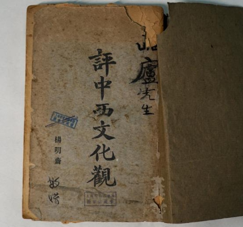 近期,图书馆在整理馆藏文献时,发现1924年初版由杨明斋撰写的《评中西文化观》一书,该藏本封面右上角毛笔书“岫庐先生”四字,左下角印刷字“杨明斋”之下书写“敬赠”二字。尾页上落有“岫庐藏书”印,应为出版家商务印书馆原总经理王云五旧藏,上海社会科学院成立时入藏图书馆。