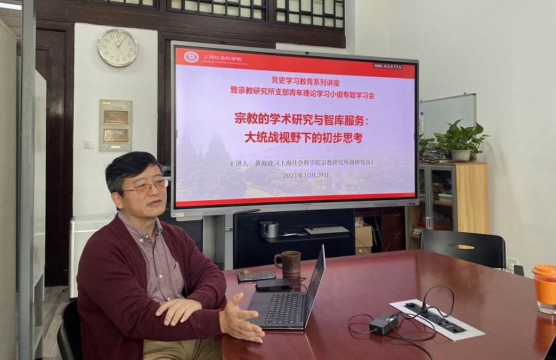 当天,宗教研究所支部青年理论学习小组开展第一次专题学习会,邀请宗教研究所黄海波副研究员做题为“宗教的学术研究与智库服务:大统战视野下的初步思考”,结合其自身开展研究的相关经历,为我所青年科研人员在“双轮驱动”与学术转型过程中遇到的困难来出谋划策、答疑解惑。支部书记晏可佳同志对在场青年党员同志提出期望,要结合《中国共产党统一战线工作条例》开展相关理论研究与应用研究,在大统战格局与大统战视野中提升科研成果的学理性、科学性和针对性,为服务国家重大理论与现实问题、服务上海城市发展贡献力量。