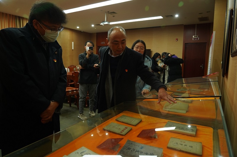 图书馆党支部书记、馆长钱运春首先邀请新闻所党支部书记、所长徐清泉一行参观学习了“马克思主义旗帜永远飘扬”馆藏文献展、“中国共产党的100年”国际巡展等,并重点参观了馆藏重要红色文献。其中有刚发现不久、全国仅存十二本的陈望道翻译的首版首印《共产党宣言》、杨明斋题签的《评中西文化观》、李达的《中国产业革命概观》、张如心的《毛泽东论》以及其他重要馆藏文献。新闻所全体党员同志兴致勃勃地观看了这些珍贵馆藏,并且向钱馆长请教了一些图书版本学问题。