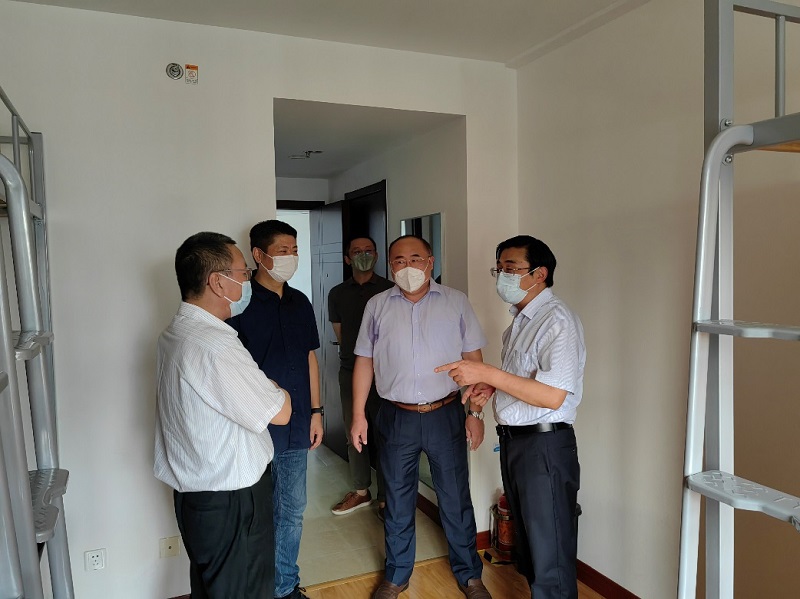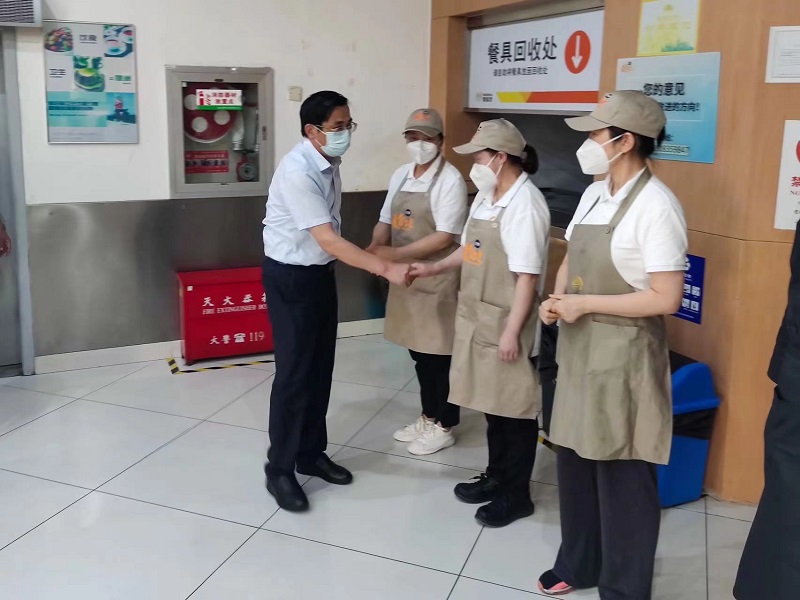 王德忠一行实地察看了院区门岗查验通道及大楼进出动线设置情况,并先后来到安防监控室、食堂、专家公寓隔离用房、学生宿舍、教室等部位,与物业、食堂、专家公寓等一线后勤保障人员进行亲切的交流,对大家在疫情封控期间恪尽职守予以充分肯定,同时向大家致以亲切问候和诚挚感谢。