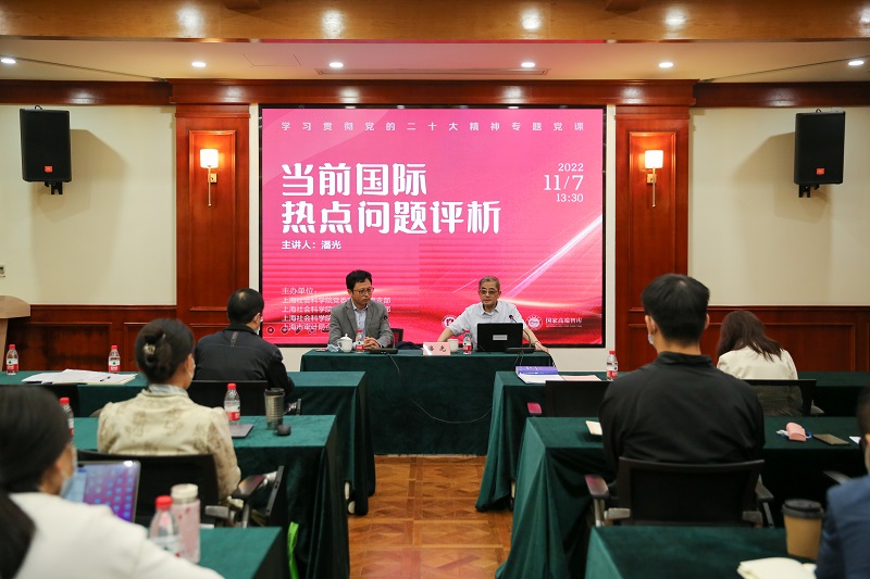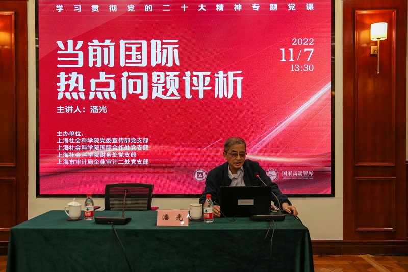 为深入学习领会党的二十大报告精神,深入学习把握习近平新时代中国特色社会主义思想的世界观和方法论,特别是习近平外交思想,2022年11月7日下午,院党委宣传部党支部、国际合作处党支部、财务处党支部及上海市审计局企业审计二处党支部等四支部联合开展主题学习活动,邀请我院国际问题资深专家、国际问题研究所研究员潘光作辅导报告。院国际合作处处长、党支部书记程福财主持会议。
