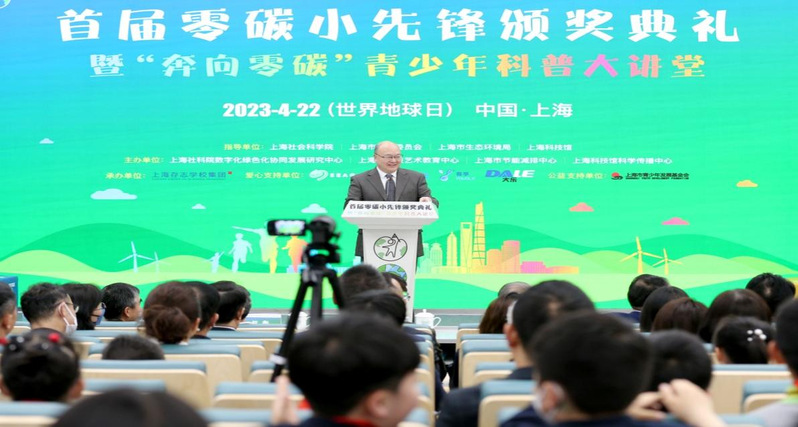 2023年4月22日,时值第54个世界地球日,首届“零碳小先锋”评选活动颁奖典礼在上海举办。来自全国各地的32位“零碳小先锋”获颁证书,15位积极参与活动的热心人士获颁“零碳爱心大使”。上海社科院数字化绿色化协同发展研究中心、上海市科技艺术教育中心、上海市节能减排中心、上海科技馆科学传播中心等四家机构共同主办,上海存志学校集团承办本届颁奖典礼。国家生态环境保护专家委员会委员、国务院三峡办原副主任胡保林,上海社会科学院党委书记权衡,上海市教育委员会二级巡视员杨伟人分别在开幕式致辞。上海科技馆馆长倪闽景,上海市生态环局副局长柏国强,上海市青少年发展基金会理事长吴仁杰等领导出席颁奖典礼。上海社科院副院长王振主持开幕式。上海社科院数字化绿色化协同发展研究中心主任、安徽长三角双碳发展研究院执行院长李易主持颁奖典礼。