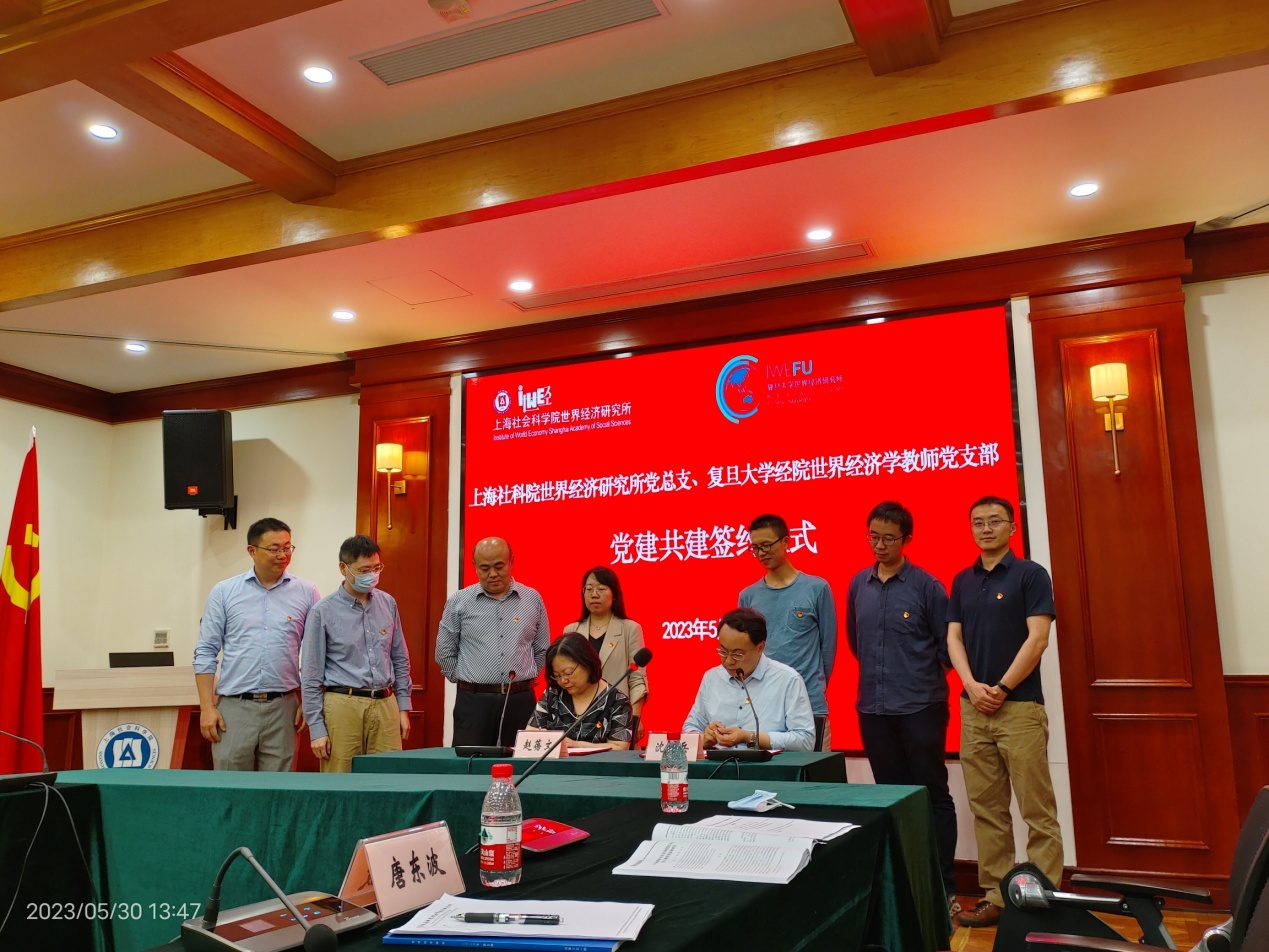 在世经所党总支委员和复旦大学经院世界经济学教师党支部党员代表的见证下,赵蓓文与沈国兵代表合作双方签署了党建共建协议书。