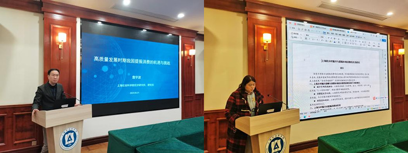专题交流环节,农工党社科院支部委员、经济所詹宇波研究员围绕“高质量发展时期我国提振消费的机遇与挑战”作专题报告,从宏观视角切入,围绕产业结构升级与转型、城镇化进程、人口结构变迁等关键领域,深入分析我国当前提振消费所面临的机遇与挑战,为推动消费增长提供了深刻见解和政策启示。农工党党员、经济所郭岚副研究员作了题为“乡村振兴与提振消费”的报告,围绕上海乡村振兴与消费市场的互动机制展开深入探讨,结合案例提出构建“产业升级—场景创新—消费反哺”的良性循环。与会人员围绕消费议题进行了充分热烈的互动讨论。