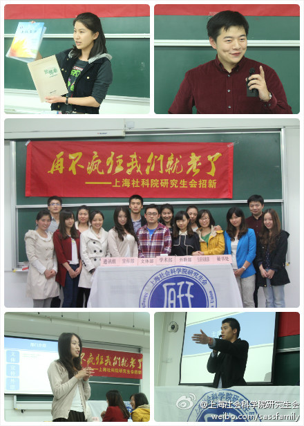 2013年11月1日与2013年11月9日两天,上海社科院第十五届研会分别于华东师范大学与社科院分部大楼举办了两次研会的招新活动,吸引了众多前来报名的一年级同学。