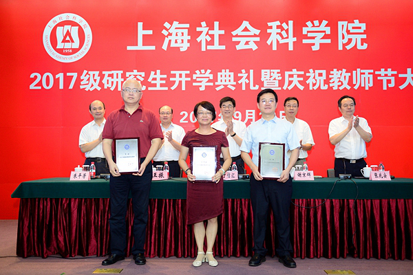 张兆安副院长宣读了2017年度“上海社会科学院优秀研究生导师“获奖名单。中国马克思主义研究所研究员胡键、宗教研究所研究员葛壮、城市与人口发展研究所的研究员胡苏云获此殊荣。上海社会科学院党委书记于信汇教授、副院长谢京辉研究员、王振研究员为获奖导师颁奖并合影留念。