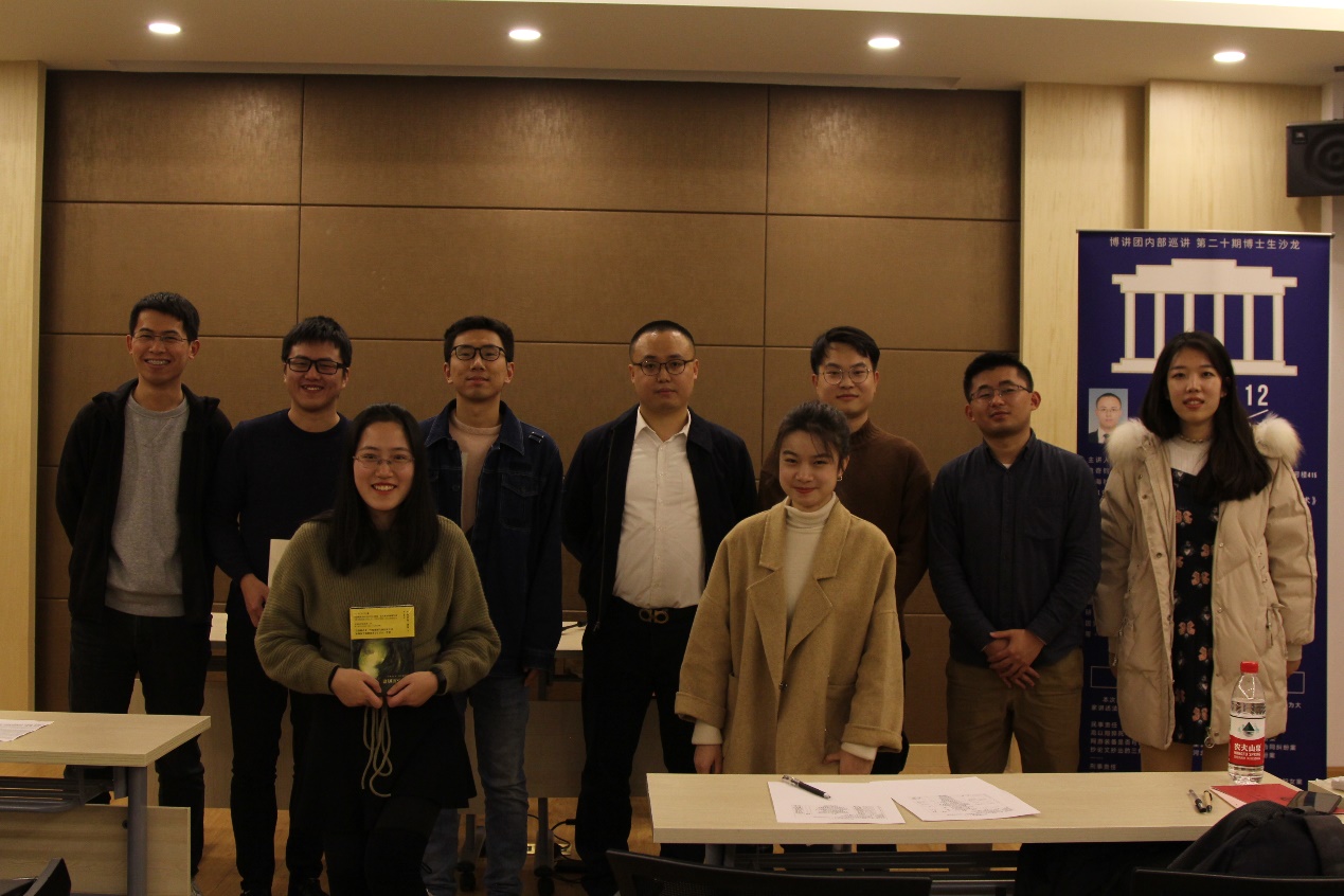 2019年12月9日,由我院博士讲师团、学生会学术部、2018级4班团支部联合主办的第二十期博士沙龙在分部二号楼415成功举行。本着服务师生、普及法律常识的原则,此次博士沙龙邀请到了上海市嘉定区人民法院法官、2019级马克思主义中国化研究专业博士研究生袁奇钧作为主讲人,通过分析典型实证案例为同学们上了一堂生动的法律知识课,使同学们收获颇丰。2019级学生贾东窈担任本次讲座的主持人。