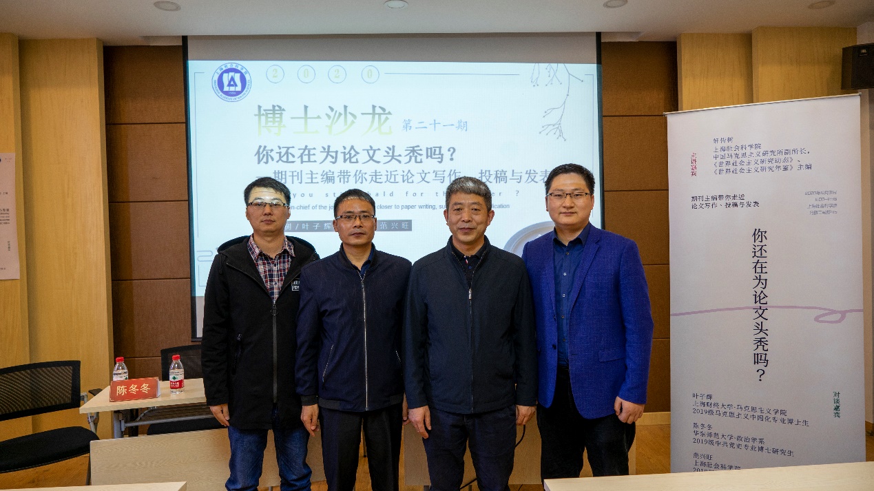 本期博士沙龙,先由担任上海社会科学院中国马克思主义研究所副所长,《世界社会主义研究动态》《世界社会主义研究年鉴》主编的轩传树老师,就如何写出高质量学术文章,给我们进行了的指导,同时也分享了一些提高投稿“中标”率的小技巧。随后,我校的范兴旺博士、上海财经大学的叶子辉博士、华东师范大学的陈冬冬博士一起在论文写作、期刊投稿等方面和轩传树老师进行了探讨。