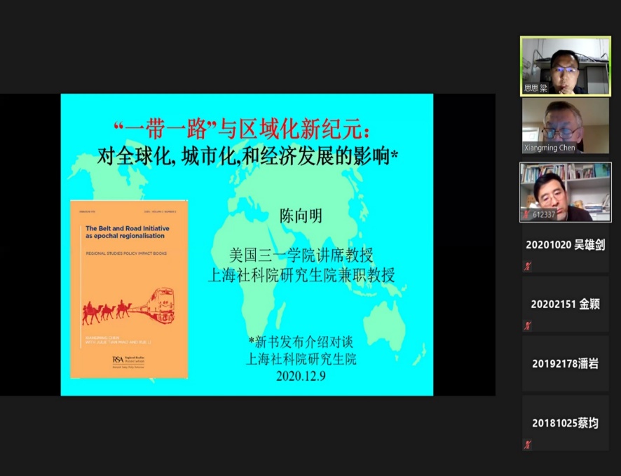 2020年12月10日上午,继“全球化变异与物流驱动发展:中欧班列和西安崛起”、“中国城市化影响全球城市化:三个渠道和三类案例的比较视角”两场讲座之后,上海社科院研究生院再次邀请到了陈向明教授为同学们带来第63期尚社讲坛:“一带一路”和区域化的新纪元,同时本期讲坛有幸邀请到屠启宇研究员作为点评嘉宾。
