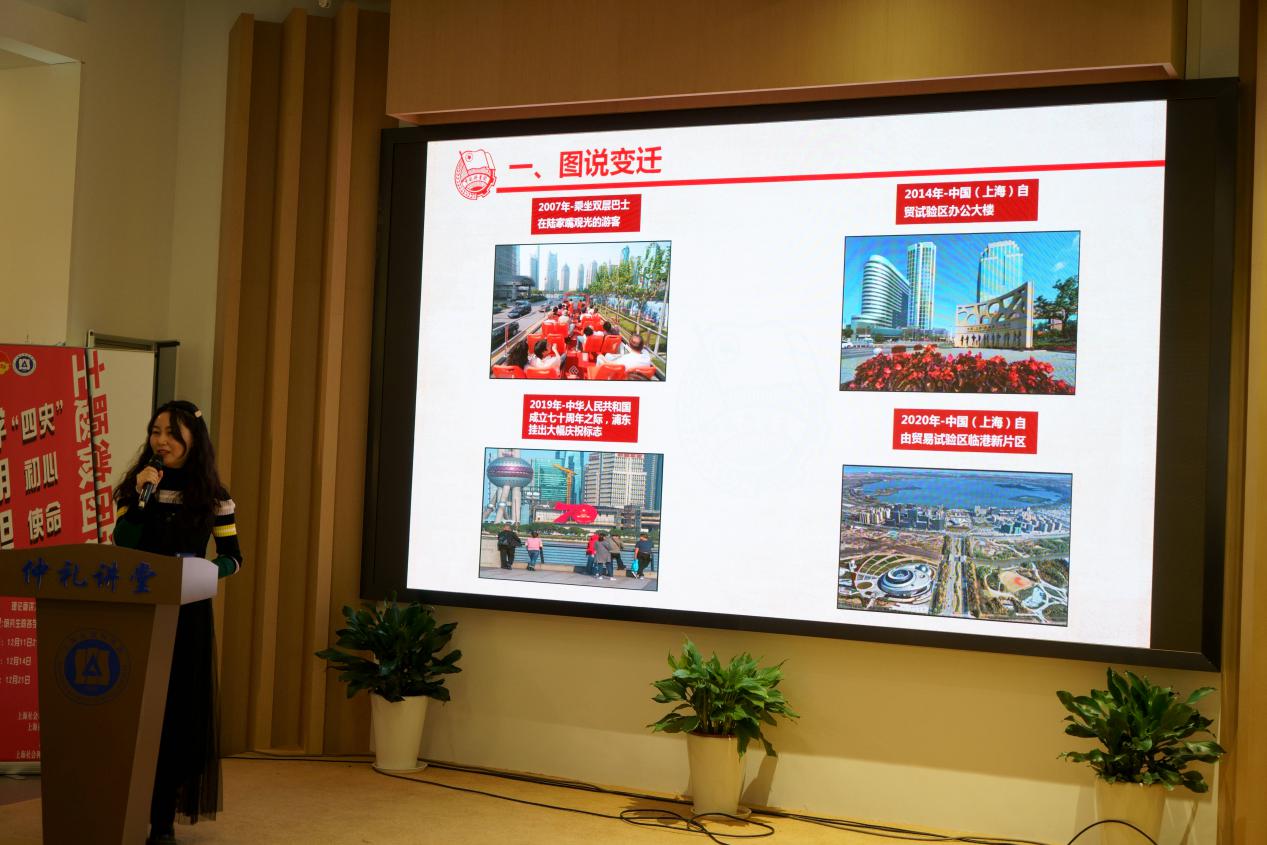 李荫将图、文、数三者结合,在图片对比、数据分析、理论陈述中带大家了解了浦东开发30年来翻天覆地的变化,分析了浦东取得卓越成就的三点原因。最后,她愿各位青年同学奋发有为,用青春续写浦东美好未来。