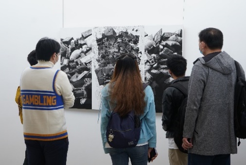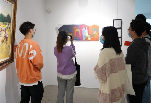 各位学生骨干按照防疫要求依次进入展馆,或驻足观望或低声交谈,一面感慨各位青年艺术家们构图、造型、技法等的高超,一面又被画作中所展现的时代精神所感染。展览规模并不算大,但从中获得的感受却能潜移默化成为内心坚实支撑力量的一部分,继续推动着大家砥砺前行。