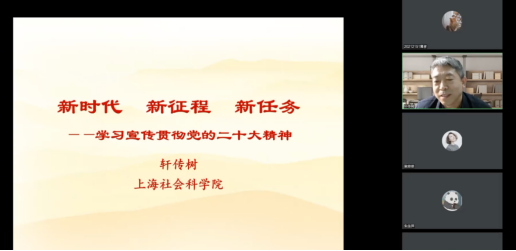 2022年12月12日上午,上海社会科学院研究生院党委书记轩传树在线为研究生院党员上党课,这也是研究生院党委组织的“学习二十大,永远跟党走,奋进新征程”系列活动的第二场专题讲座。研究生院全体研究生党员、职工党员和2022年党团骨干训练营成员参加。