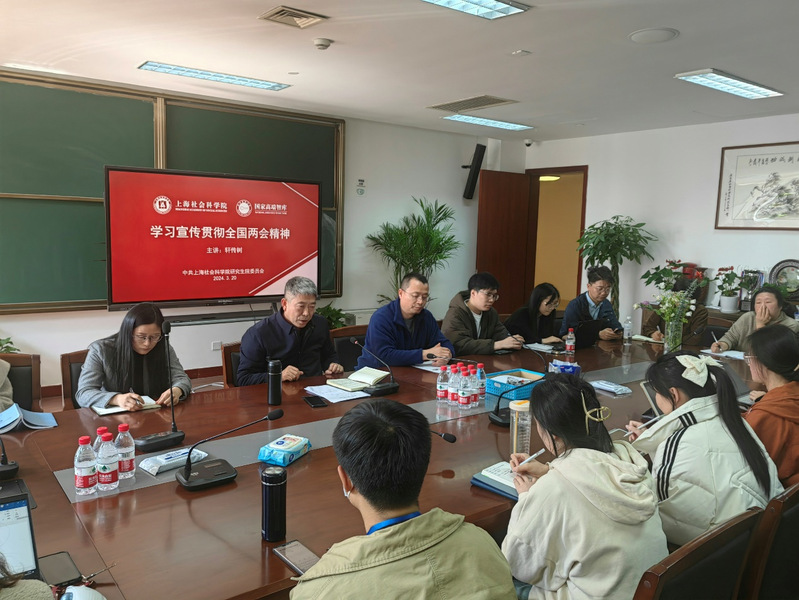 轩传树首先传达了3月15日上海社科院党委中心组学习扩大会议的精神,然后结合学习材料重点介绍了十四届全国人大二次会议的指导思想、主要议程、主要特点、总书记讲话精神、大会通过的各项报告要点等,并分享了自己的学习心得。