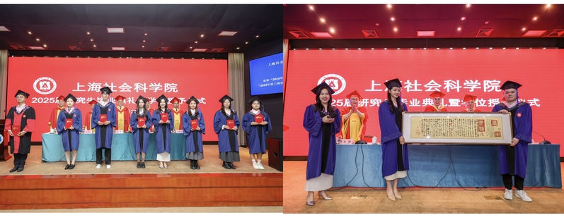 典礼上,上海社会科学院党委书记权衡与各位院领导代表母校接受2025届毕业生献礼;干春晖副院长为全体毕业生一一拨穗、颁发学位证书并合影留念;党委副书记姚建龙宣读了“2025年度上海市优秀毕业生”、“2025年度上海社会科学院优秀毕业生”名单,主席台就坐领导为获奖毕业生颁发荣誉证书;副院长吴雪明宣读了“上海社会科学院授予学位决定”。