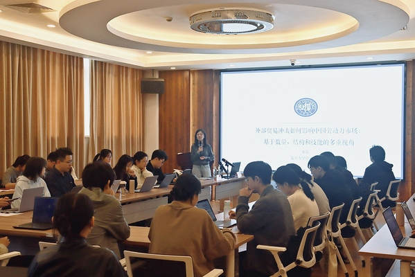 宋教授以“外部贸易冲击如何影响中国劳动力市场”为主题,展示了该领域最新研究动态,介绍了如何选题、使用平台数据库和机器学习前沿方法。她指出,近年来,持续升级的外部贸易冲击对中国劳动力市场产生了复杂而深远的影响。尤其在经济增速调整和劳动力市场结构性矛盾凸显的现实背景下,全面评估贸易冲击对劳动力市场需求的影响,具有重要的学术价值和政策意义。基于2017—2020年中国招聘平台的高频细分数据,宋教授系统考察了美国加征关税对中国城市劳动力需求数量和结构的影响效应,并重点关注其在不同细分行业和群体之间的异质性。最终通过自然语言处理方法,结合招聘和职业名称词典数据构造技能吸纳强度指标,量化了关税冲击对劳动力市场不同维度技能需求的影响。本次讲座在热烈的掌声中圆满落下帷幕。宋教授的分享兼具理论深度与实践参考价值,不仅深化了大家对于外部贸易冲击与劳动力市场动态关系的理解,更为相关领域的研究方向和政策思考提供了重要启发。