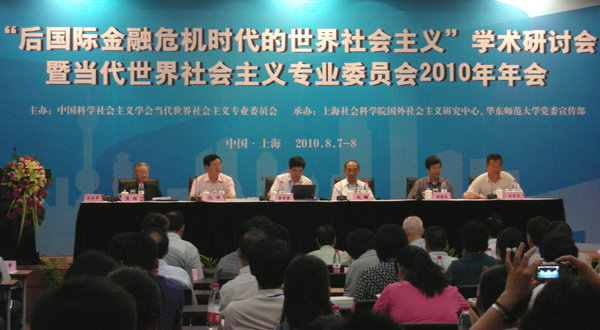 8月7-8日,“后国际金融危机时代的世界社会主义”学术研讨会暨当代世界社会主义专业委员会2010年年会在上海社会科学院国际创新基地召开。会议由中国科学社会主义学会当代世界社会主义专业委员会主办,上海社会科学院信息所国外社会主义研究中心、华东师范大学党委宣传部承办。大会开幕式由中央编译局副局长王学东研究员主持,院党委副书记童世骏研究员、华东师范大学副校长范军、中国科学社会主义学会会长胡振良教授出席会议并致辞。7日上午大会主题发言由信息所国外社会主义研究中心主任徐觉哉研究员主持。