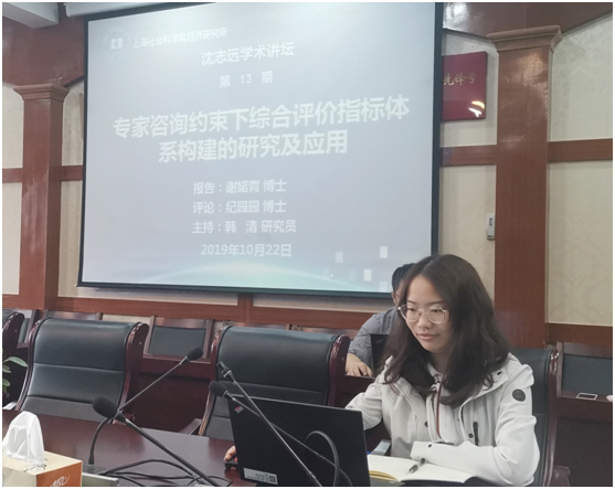 2019年10月22日上午,“沈志远学术讲坛”第13期在经济所会议室如期举行,谢婼青博士作了题为“专家咨询约束下综合评价指标体系构建的研究及应用”的学术报告。报告会由经济所统计学与数量经济研究室主任韩清研究员主持,纪园园助理研究员担任评论人,全所科研人员参加。