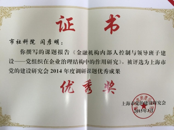 由经济所闫彦明研究员主持的课题《金融机构内部人控制与领导班子建设——党组织在企业治理结构中的作用研究》,被评选为上海市党的建设研究会2014年度调研课题优秀成果奖。原经济所副所长蒋铁柱研究员对该研究进行了理论指导。