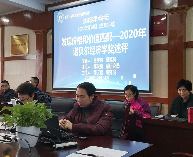 2020年12月14日上午,经济研究所“沈志远学术讲坛”(第20期)由经济研究所研究员詹宇波主讲,题目为“价格和价值匹配-2020年诺贝尔经济学奖述评”。本次讲坛由经济所副所长韩汉君研究员主持,经济所统计学与数量经济研究室邸俊鹏副研究员担任评论人。