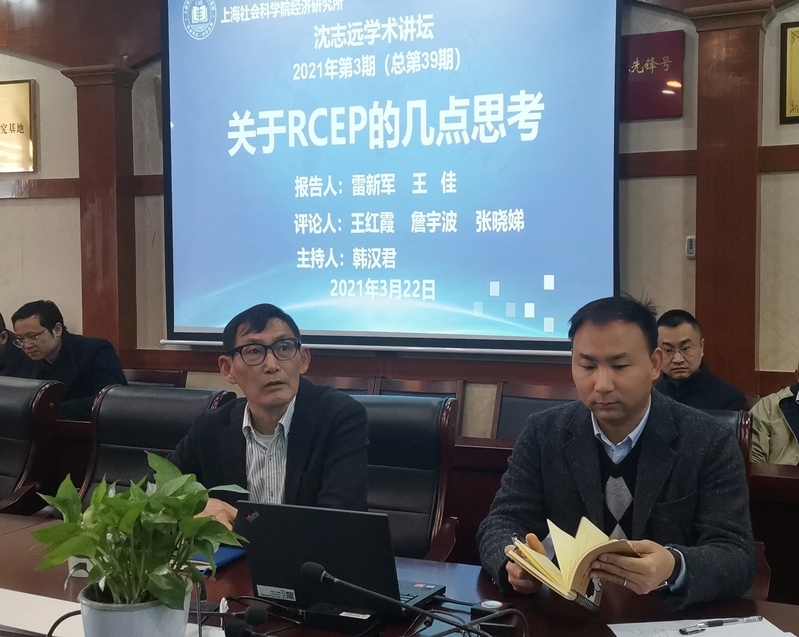 2021年3月22日上午,上海社会科学院经济研究所第39期《沈志远学术讲坛》在经济研究所503会议室举行。雷新军副研究员与王佳博士作了题为“关于RCEP的几点思考”的学术报告。报告会由韩汉君研究员主持,王红霞研究员、詹宇波研究员、张晓娣副研究员担任讨论人。报告开始之前,韩汉君研究员就RCEP协定的相关内容作了介绍并提出一些注意事项。