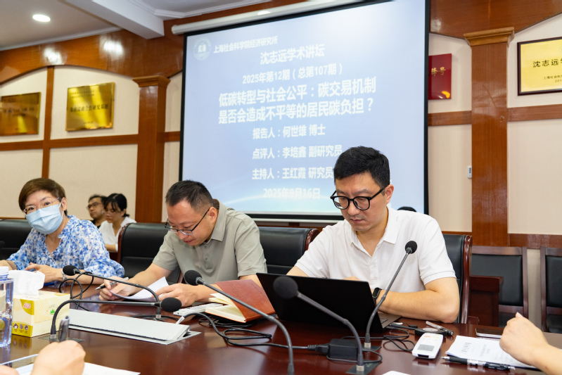 2025年9月16日上午,上海社会科学院经济研究所《沈志远学术讲坛》2025年第12期(总第107期),由何世雄博士作了题为“低碳转型与社会公平:碳交易机制是否会造成不平等的居民碳负担?”的学术报告。本次报告由王红霞研究员主持,李培鑫副研究员担任评论人。