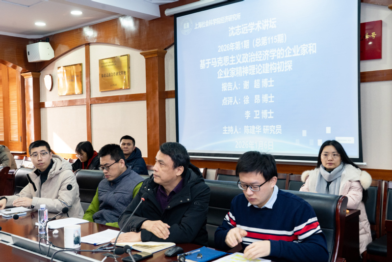 2026年1月6日上午,上海社会科学院经济研究所《沈志远学术讲坛》2026年第1期(总第115期),由谢超博士作题为“基于马克思主义政治经济学的企业家和企业家精神理论建构初探”的学术报告。本次报告由陈建华研究员主持,徐昂博士和李卫博士担任评论人。