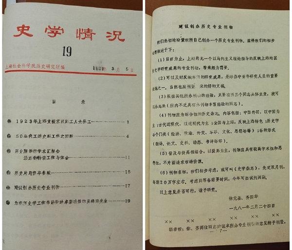 1981年3月5日刊出的《史学情况》以及徐元基、齐国华两位先生提出创办历史专业刊物的建议。