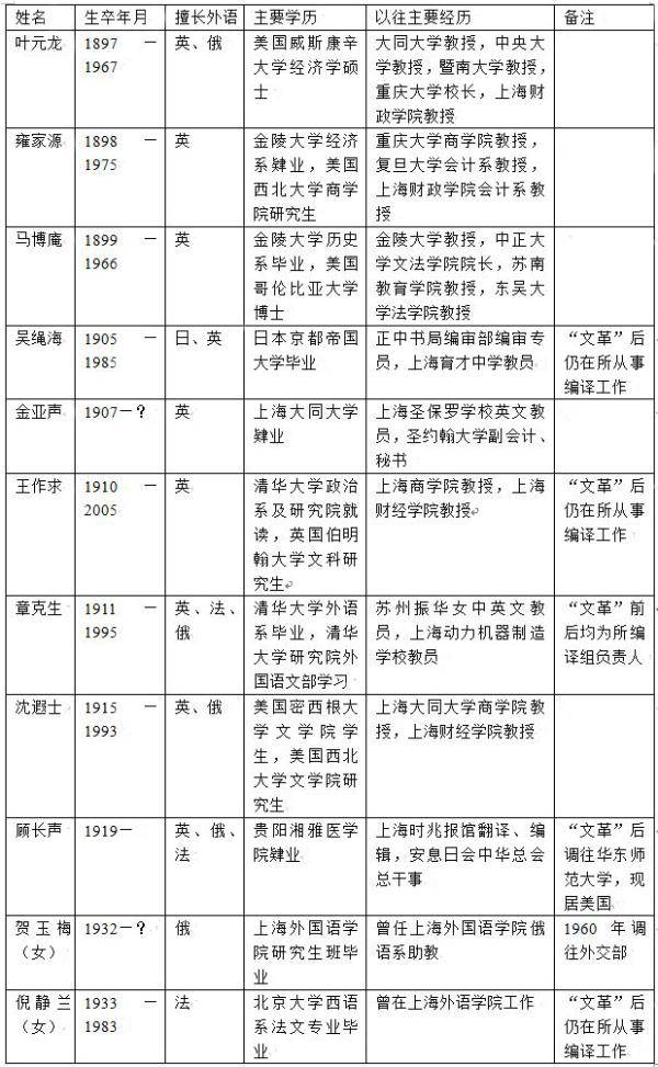 上述11人均属于以章克生为负责人的“编译组”,但“文革”前的“编译组”始终没有成为有固定办公室的专门性的常设机构,而不过是一个旨在指挥、协调、联系具体翻译业务的名义性的“软组织”。察诸1963年4月历史研究所的一份花名册,马博庵、沈遐士、雍家源、吴绳海4人隶属于近代史组,王作求、章克生、叶元龙、顾长声、金亚声、倪静兰6人隶属现代史组,贺玉梅则已经调离。若按年龄区分,11人可分成老、中、青三代,老、中两代人中不乏名校毕业生,甚至是曾求学海外名校的留学生、洋博士,多数人以往在社会上和学术界还颇有名望,有的人著、译丰硕;至于年轻的一代,也都是刚从著名大学的外语系毕业分配而来的。