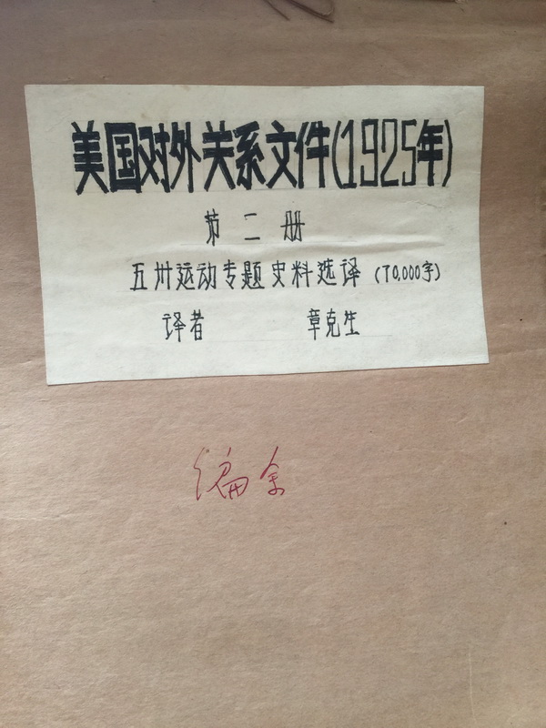 其二是《五卅运动史料》。早在1962年初,历史研究所就开始组织力量编纂五卅运动史料,由于“文革”的影响,该工作停顿了十多年,直到1978年才重上轨道,并将成果陆续汇编出版。全书分为3卷,分别出版于1981年11月、1986年8月、2005年12月,总字数达212万。该书取材广泛,内含不乏十几个种类的外文资料,如《大陆报》、《字林西报》、《密勒氏评论报》、《工部局董事会会议录》、《美国外交关系文件》、《日本外务省档案》,等等。几十万字的译文应该归功于章克生、吴绳海、叶元龙、倪静兰和金亚声。