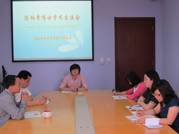 6月19日上午,台湾成功大学政治经济研究所博士候选人陈柏奇到访新闻研究所,与本所科研人员进行了学术交流。新闻研究所所长强荧研究员对陈柏奇博士的来访表示了热烈欢迎,认为本次活动迈出了本所两岸学术交流的第一步。陈柏奇博士的研究兴趣集中在大陆互联网政治、两岸经贸关系及区域经济等领域,他正在撰写的博士论文题目为《新媒体时代下的中国网络政治:变迁中的国家――社会关系》,此次来访也是希望与本所研究人员交流对当下国内互联网发展的观点和看法,为其博士论文搜集资料。