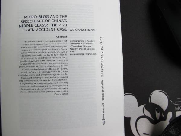 新闻所现代传媒研究中心助理研究员吴畅畅日前以<Micro-Blog and the Speech Act of China's Middle Class>(《微博与中国中产阶级的言语――行动》)一文发表在欧洲传播学期刊《Javnost:The Public》2012年第2期,该杂志属于“社会科学引文索引”(俗称SSCI),由欧洲传播与文化研究机构主办,主要关注全球范围公共领域的建设与发展,并鼓励跨学科研究。