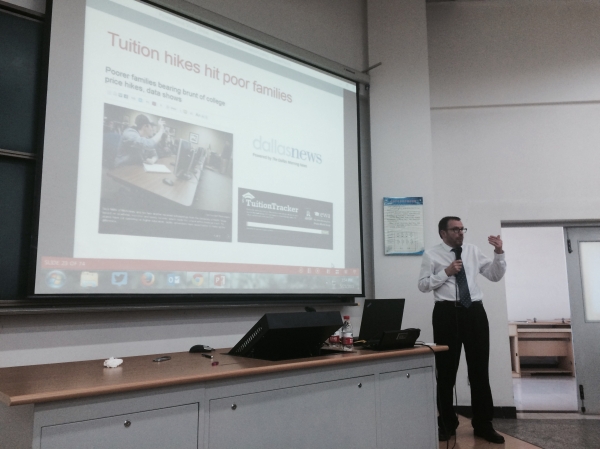 授课教师戴维・赫佐格是密苏里大学新闻学院的副教授和全美调查性新闻协会资深数据编辑兼培训师,同时也是美国计算机辅助报道协会的学术顾问。在为期三天的工作坊中,通过大量的数据新闻案例,展示了美国新闻同行在数据新闻和可视化新闻方面的最新进展,重点介绍了如何通过大数据和数据挖掘发现新闻,进行调查性报道,如何通过可视化和互动化方法更好的呈现新闻内容,还介绍了相关的平台和软件等,重点讲述了互动地理图释、数据获取来源等内容,在很短的时间内搭建起关于数据新闻、计算机辅助新闻报道的知识框架。