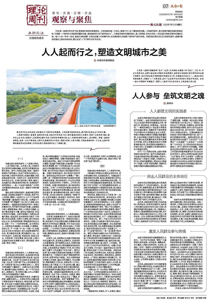 文明是一座城市最靓丽的“名片”,也是人民幸福生活最暖心的“底色”。2021年,中央文明委决定,在第七届全国文明城市评选周期中,选取部分有较强示范引领作用的全国文明城市,先行开展全国文明典范城市创建试点工作,成都被列为试点之一。建设全国文明典范城市,关键在“人”,归根结底,是为了让全体市民共同享受文明进步的成果。这是一场永不停歇的“幸福接力”,需要人人驰而不息支持与参与,方能垒筑文明之魂。