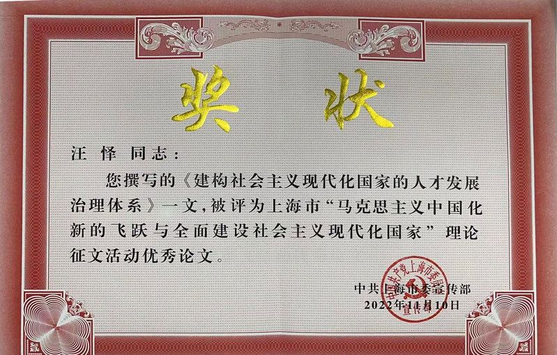 汪怿研究员撰写的《建构社会主义现代化国家的人才发展治理体系》一文,被评为上海市“马克思主义中国化新的飞跃与全面建设社会主义现代化国家”理论征文活动优秀论文。