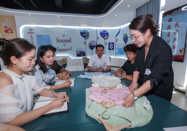 2024年6月18日,在位于洪合镇新王桥村的嘉兴市众创毛衫精品市场的党群服务中心,嘉兴市秀洲洪合毛衫商会第二党支部的支部书记田银燕(右一)为商户们介绍新款毛衫并共同商讨推广方案。新华社记者 徐昱 摄