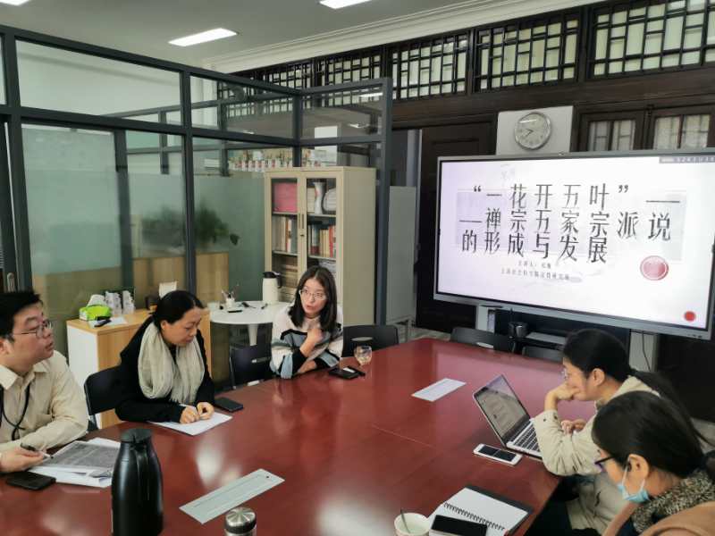 为庆祝宗教研究所成立四十周年(1980-2020),宗教所举办青年学者学术分享会。首期主讲人是宗教研究所助理研究员孔雁博士。2020年11月5日上午,孔博士在宗教所会议室与同事分享了她最近的研究成果:《“一花开五叶”——禅宗五家宗派说的形成与发展》。
