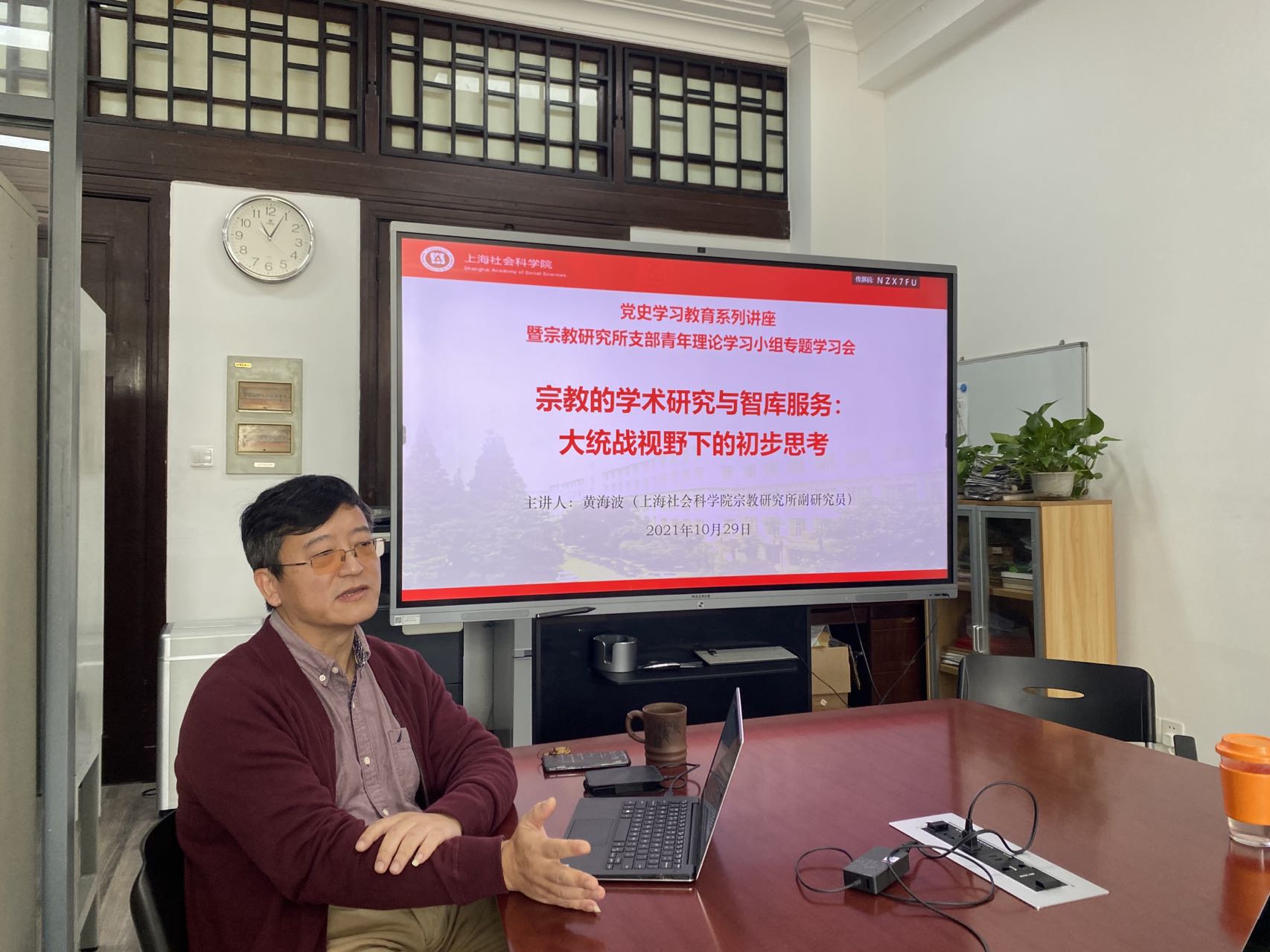 为进一步推动党史学习教育活动走深走实,学习重温、深刻领悟习近平同志2007年3月至10月担任上海市委书记期间的丰富政治智慧、高超领导才能、勤勉工作精神、真挚人民情怀、强大人格精神,宗教研究所支部于2021年10月29日举办学习《习近平在上海》主题党日活动,并邀请中共上海市委党校邹磊副研究员做题为“从《习近平在上海》学习总书记的政治智慧”专题讲座。