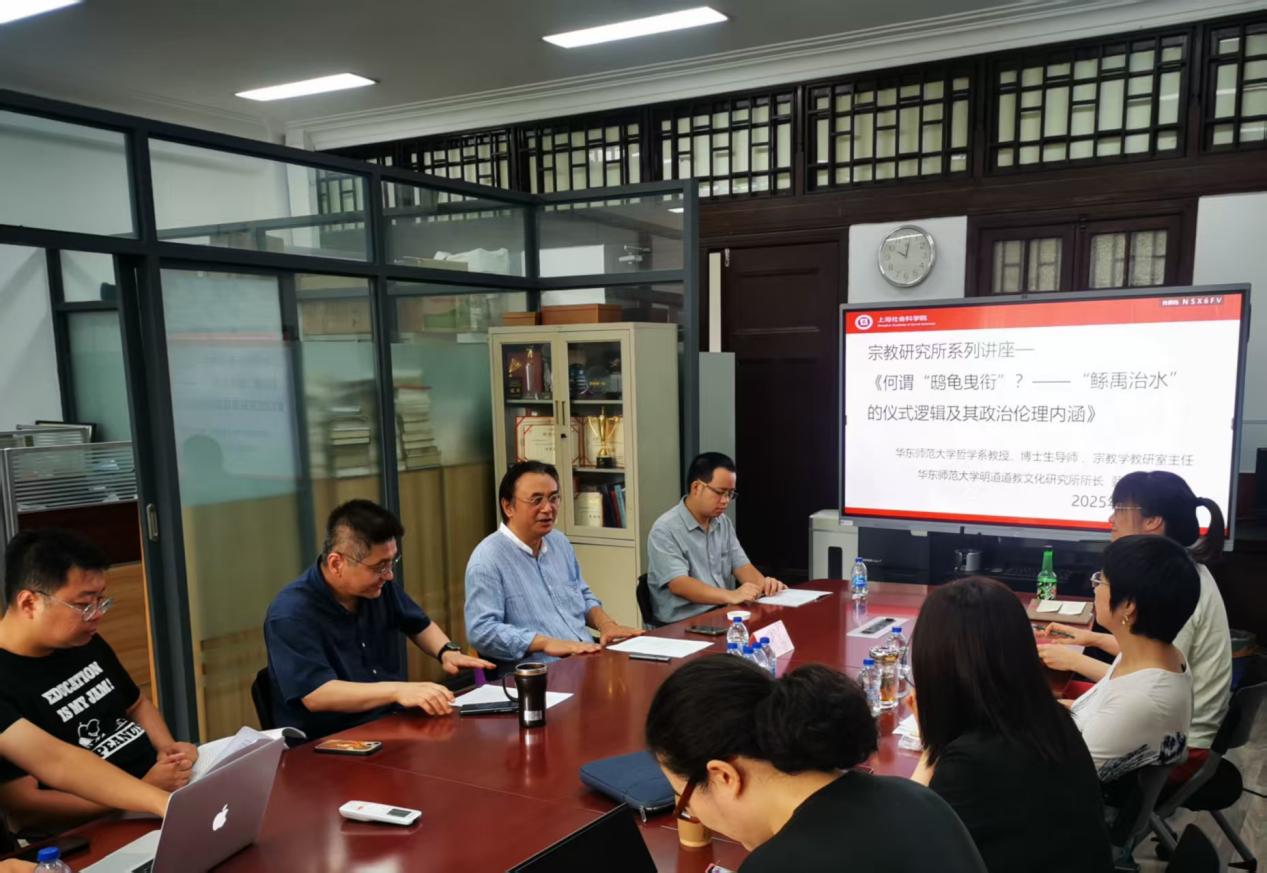 2025年9月12日上午,华东师范大学哲学系宗教学教研室主任、华东师范大学明道道教文化研究所所长蔡林波教授应邀在宗教研究所341会议室举办主题为“何谓‘鸱龟曳衔’?——‘鲧禹治水’的仪式逻辑及其政治伦理内涵”的学术讲座。此次讲座由宗教研究所宗教学研究室主任邱文平副研究员主持,佘凌副所长出席,部分科研人员、研究生院宗教学专业硕士研究生共二十余人参加了讲座活动。