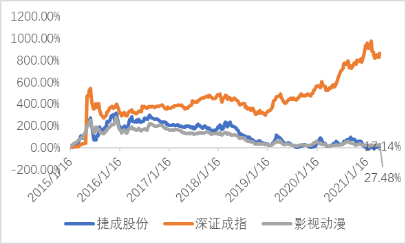 从近两年来看,公司市值冲高回落,与申万影视动漫指数走势基本一致,整体表现大幅低于深证成指。截至2021年4月27日,捷成股份市值94.7亿,近五年增长12.40%。动漫影视行业指数累计增长26.94%,深证成指累计增长857.73%。
