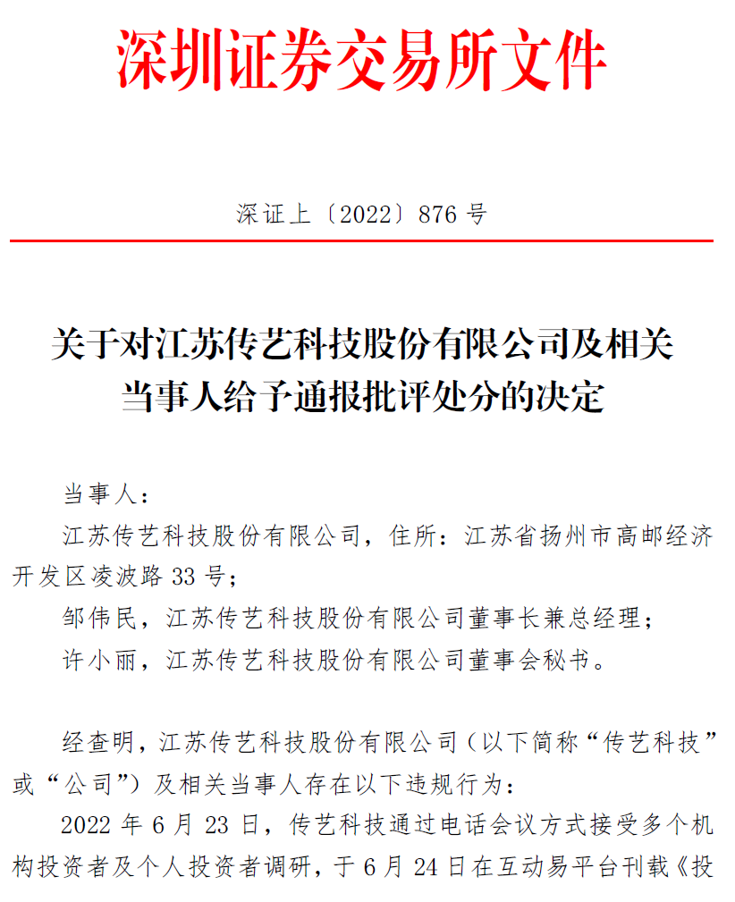 近日,传艺科技及公司董事长、董秘被深交所通报批评的消息将这家公司再次推至风口浪尖,原因系今年6月底公司在日常与投资者的交流上没有注意尺度,泄露还未经公告披露的“重大信息”而违规。