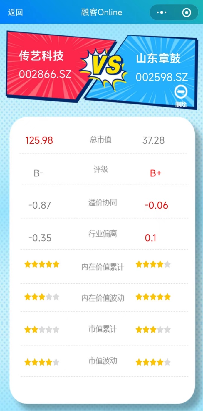 市值端方面:传艺科技市值变动和市值波动分别为2星和4星,市值累计出现下跌,特别是2021年初以来,公司市值在业绩推动下大幅上涨后未能站住高位,在业绩基本稳定的同时市值呈现持续下滑趋势,成为溢价协同不断恶化的推手。