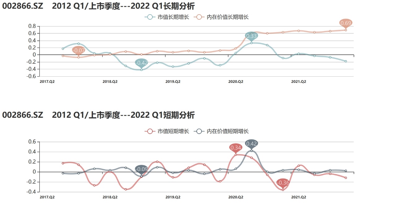 截至2022年1季度,传艺科技评级为B-,公司健康状况一般。截至2022年1季度,公司上市以来内在价值累计上涨但市值出现下跌,公司市值变动情况未能较好反映其内在价值变动,溢价协同持续下滑逼近合理区间边缘。受益于二季度以来公司激进的市值表现,溢价协同也有望迎来大幅回升。