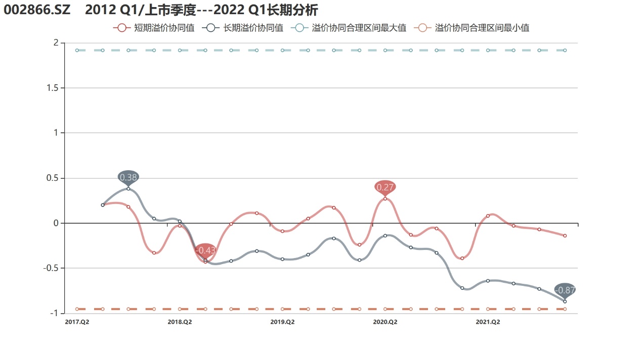 行业偏离:截至2022年1季度,传艺科技的行业偏离值为-0.35,表明溢价协同持续下滑下,公司长期溢价协同表现也越发落后于行业平均,企业健康水平敲响警钟。