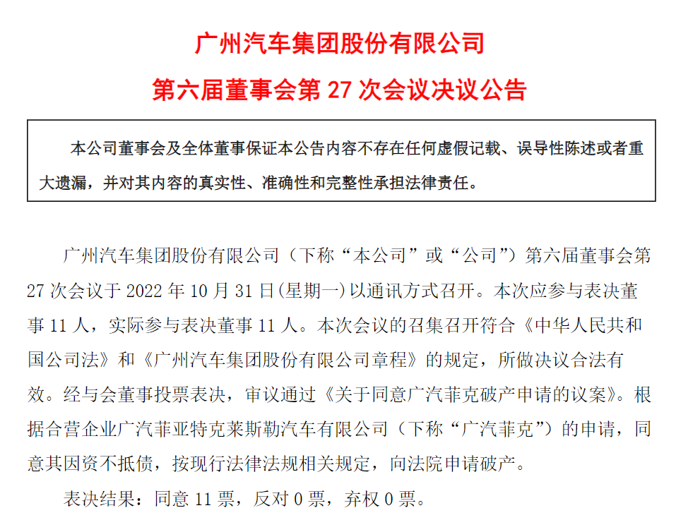 10月31日,Stellantis发布公告称,合资公司广汽菲克的股东双方——广汽集团和Stellantis集团已经批准一项决议,同意广汽菲克在资不抵债的情况下申请破产。同日,广汽集团也发布公告确认这一消息。