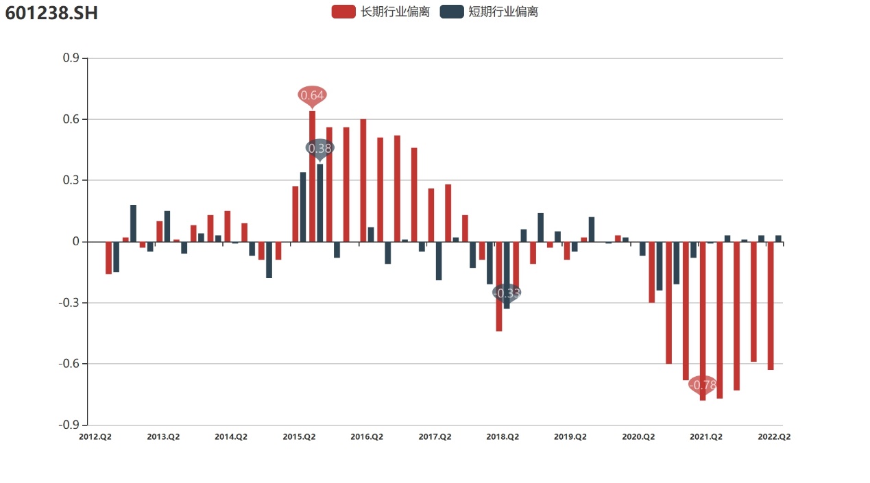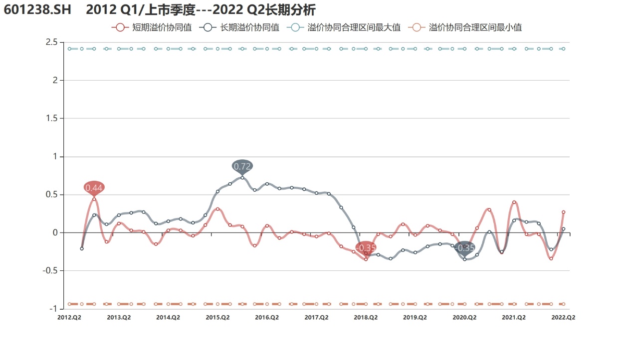 行业偏离:截至2022年2季度,广汽集团的行业偏离值为-0.63,表明公司长期溢价协同表现大幅落后于行业平均水平。行业偏离图显示,公司近一段时期的行业偏离出现大幅恶化,主要系行业总体获得了更高溢价,而广汽集团未能在其中分得一杯羹。