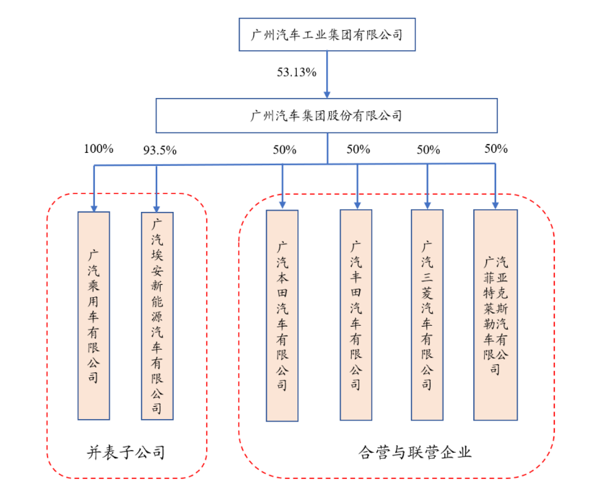 广汽的整车业务旗下主要有广汽乘用车、广汽埃安新能源等并表子公司;广汽本田、广汽丰田、广汽三菱以及即将退市的广汽菲克等合营或联营企业。