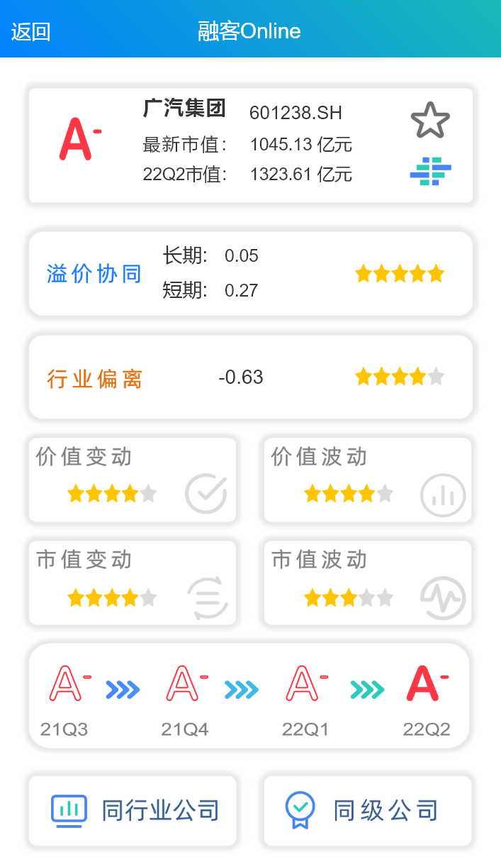 今天我们就从溢价协同的角度对广汽集团进行一次初步“体检”。在小程序首页输入公司代码/首字母/证券简称,进入广汽集团的公司界面,可以看到广汽集团截至2022年2季度的数据情况。