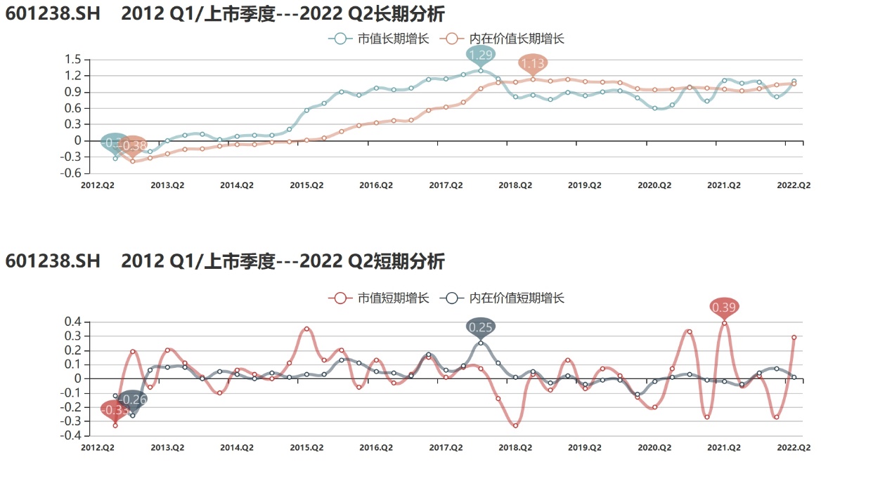 市值端方面,广汽集团的市值变动和市值波动分别为4星和3星,受内在价值“天花板”影响,公司市值也在2017年底达到累计增长峰值后出现大幅回落,且多数时期落于价值线之下,成为溢价协同恶化的开始。