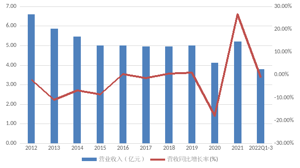然而众多老字号招牌依旧难以拉动西安饮食的整体业绩,公司像多数老字号一样陷入了困局。相较在资本市场上长达5年的低迷,公司在经营上的低迷远不止5年。公司10年来的营收从6.59亿元负增长掉至2021年的5.19亿元,近些年更是被牢牢按死在5亿左右的水平寸步难行。